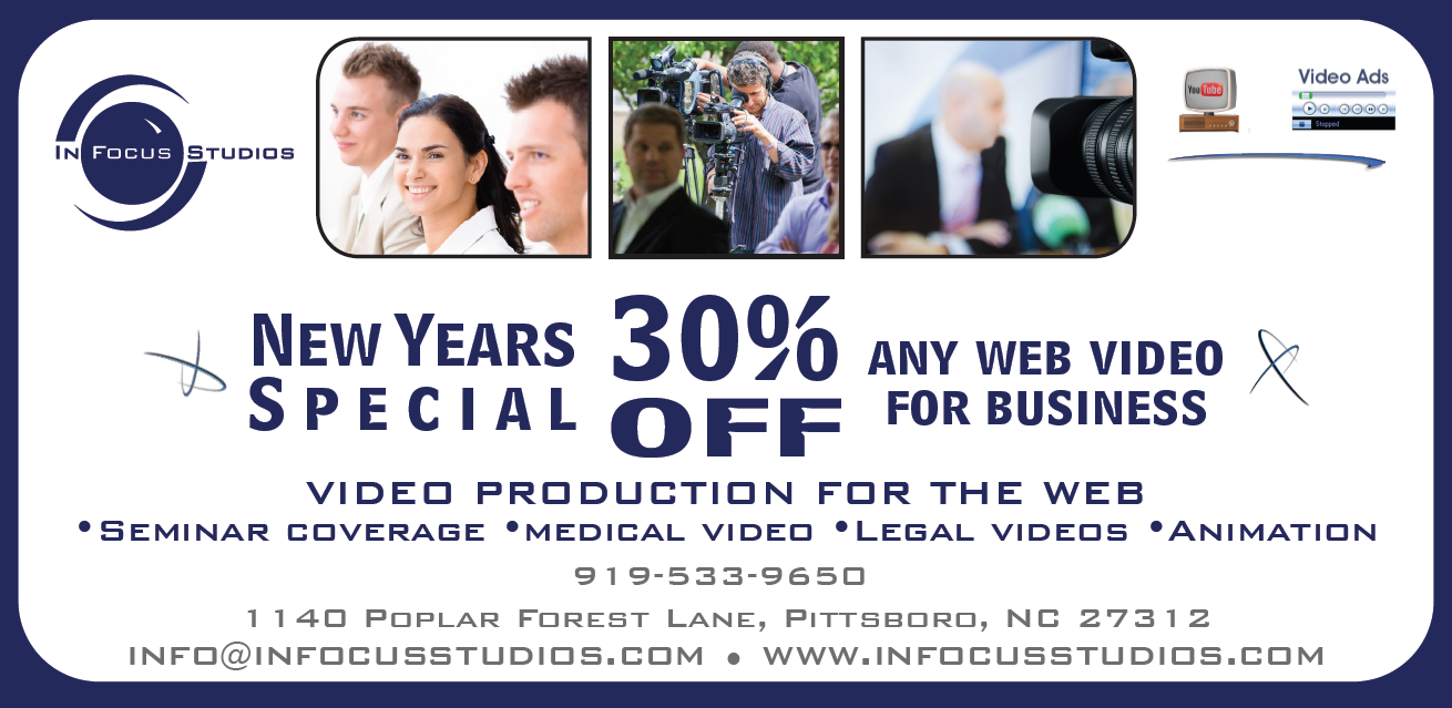 To help you kick off the year right, In Focus Studios is offering a special New Year discount! Get 30% off ANY video you need for your business! We can produce web videos, create marketing and promotional videos, capture live events and seminars, or bring your business to life through animation. We can help you plan, produce, edit, and finish any video you need to showcase your brand, preserve a special moment, or promote an important event.